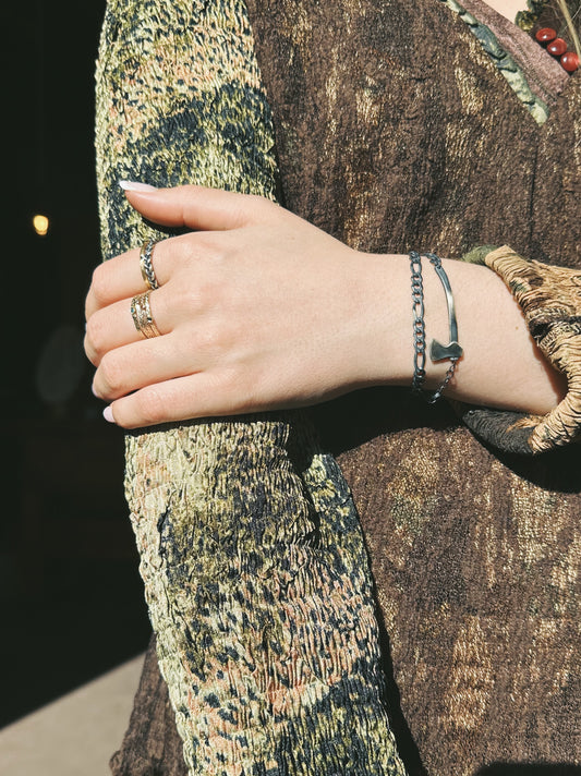 Verkfæri eru áþreifanlegir hlutir sem notaðir eru til að ná fram ákveðnu markmiði. Hvert verkfæri hefur sitt hlutverk og hvert hlutverk er jafn hversdagslega heillandi. Ásýnd þeirra er ekki síður heillandi, hönnun þeirra, virkni og viðkoma; mýkt formsins og kuldi málmsins. Verkfærin taka sér táknræn hlutverk, þau eru táknmynd erfiðisvinnu og dugnaðar. Við stöndum öll í þakkarskuld við formæður og -feður okkar sem unnu hörðum höndum við að byggja upp það samfélag sem við þekkjum í dag. Skartgripalínan Verkfæri er á sinn hátt óður til hversdagshetjunnar sem leggur sitt af mörkum með verkfærið að vopni.