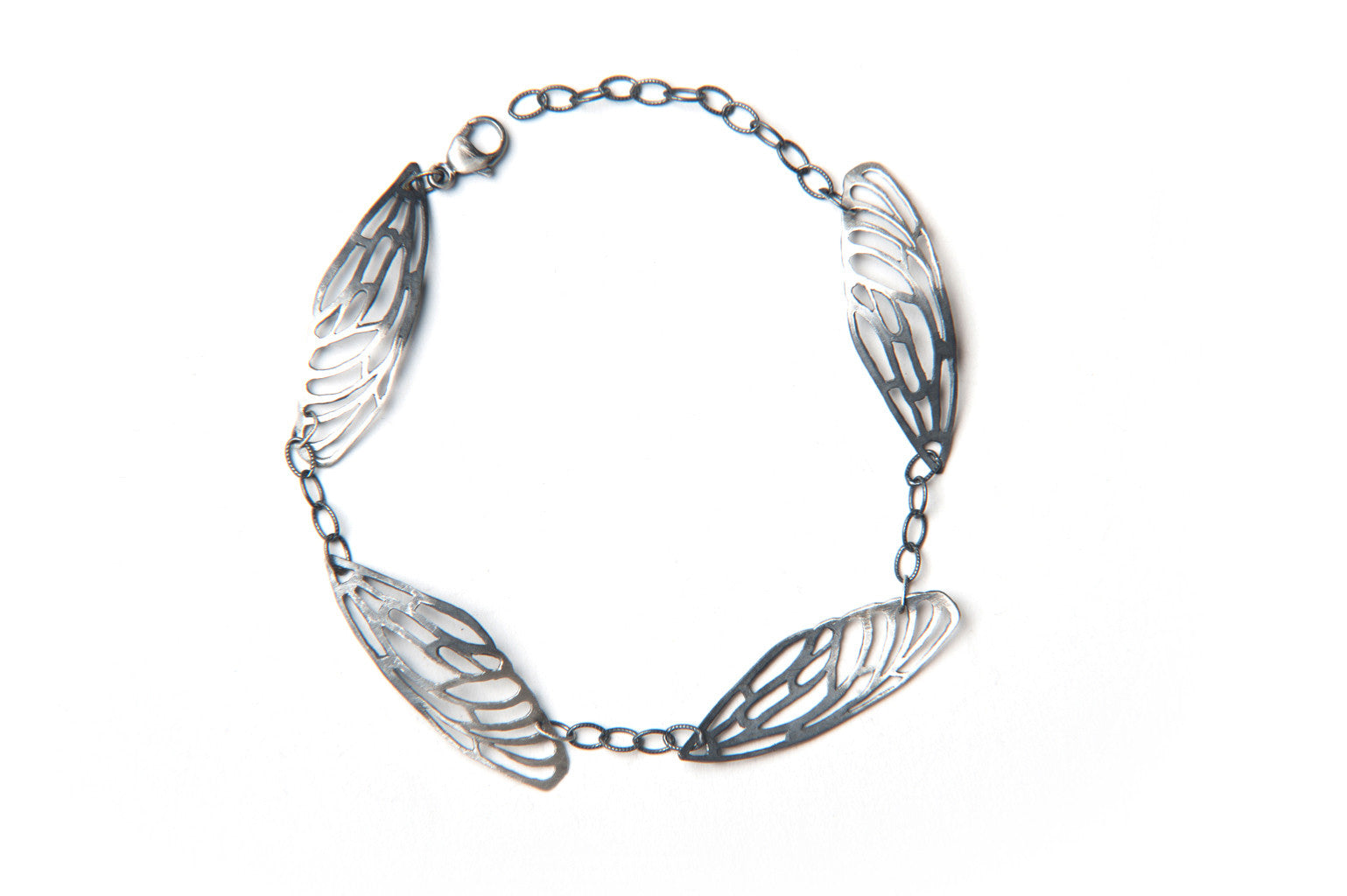 Four silver wings on an oxidized silver chain with an oxidized silver lock.